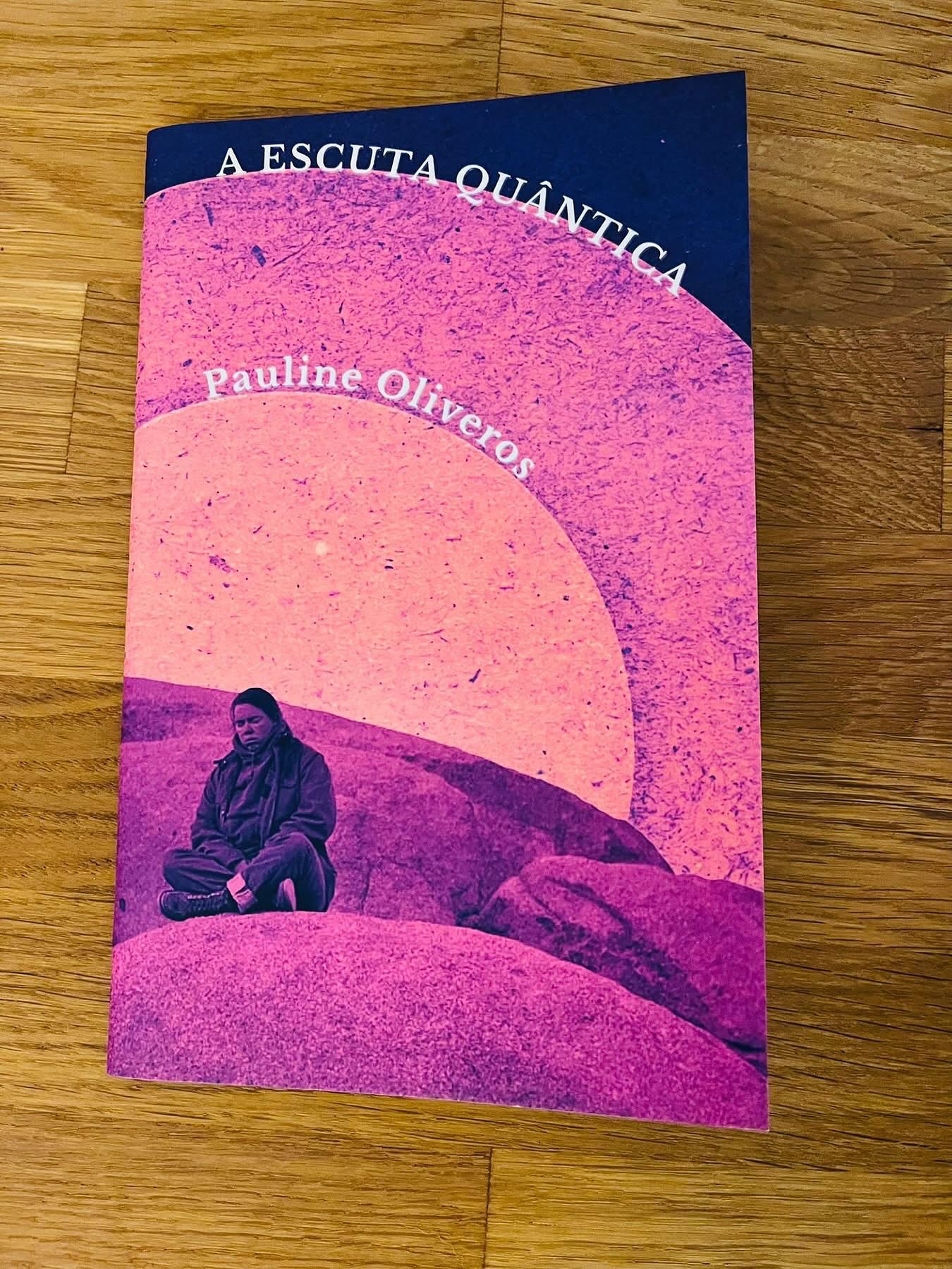 • Capa do livro A Escuta Quântica de Pauline Oliveros com imagem de pessoa sentada sobre rochas em tons rosa e roxo.