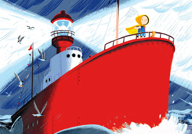 • Ilustração de navio farol vermelho com menina e gato no convés e gaivotas voando