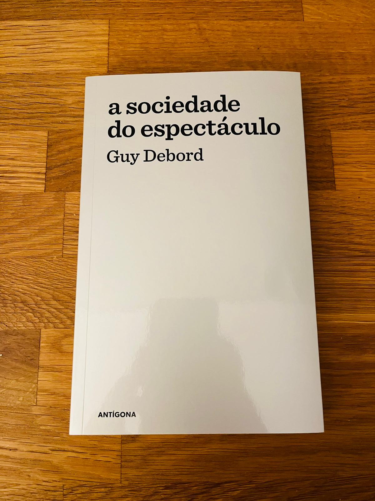 • Livro branco 'a sociedade do espectáculo' de Guy Debord sobre mesa de madeira