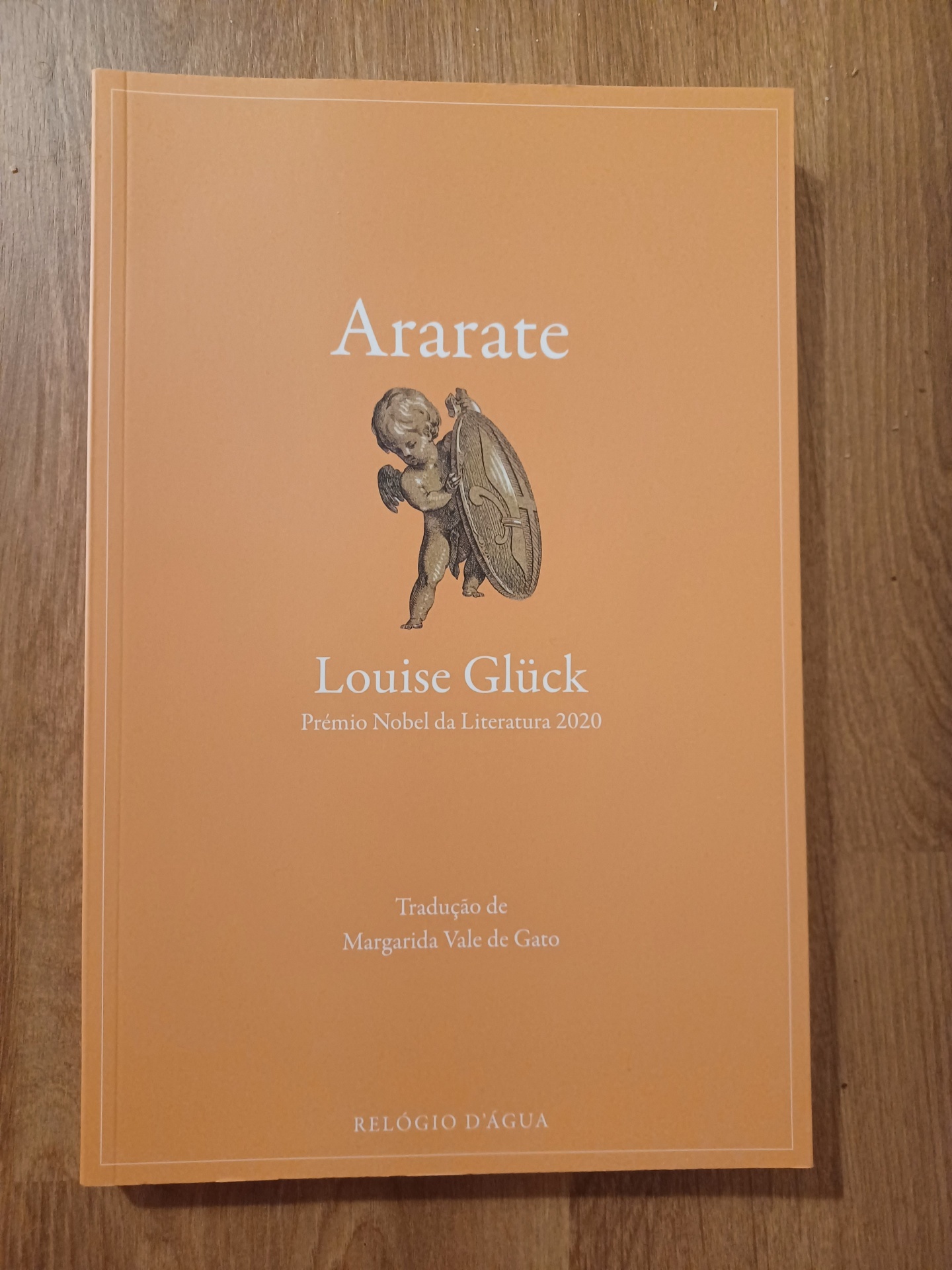 Livro 'Ararate' de Louise Glück com capa laranja e figura segurando escudo
