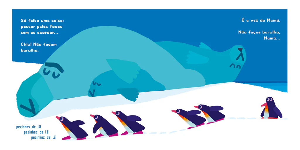 Está na hora de jantar e os pinguins vão para o mar apanhar peixe. O Pequeno Pinguim já tem saudades: A Mamã vai voltar muito depressa, não vai? — pergunta ao Papá. Olha, conseguiu! Os pinguins saltam do mar e começam a escalar o gelo escorregadio. Cuidado, Mamã! Quase a chegar, têm de passar pelas perigosas focas adormecidas. Não faças barulho, Mamã!