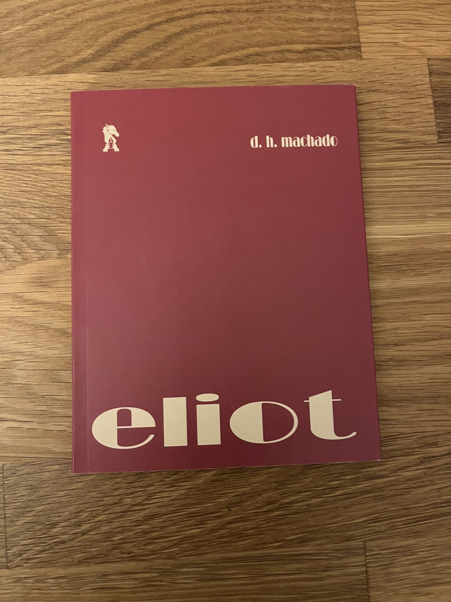 • Livro bordô com título 'eliot' e autor 'd.h. machado' sobre madeira clara