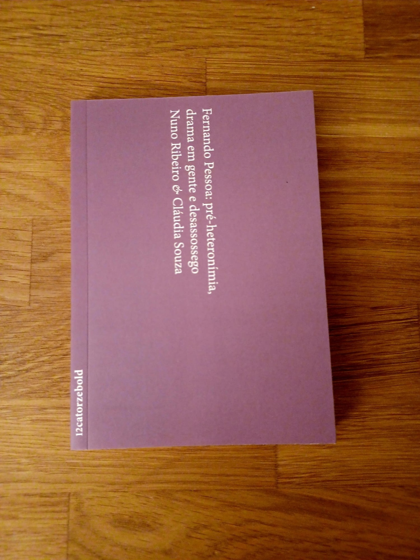 • Livro lilás com texto branco sobre mesa de madeira