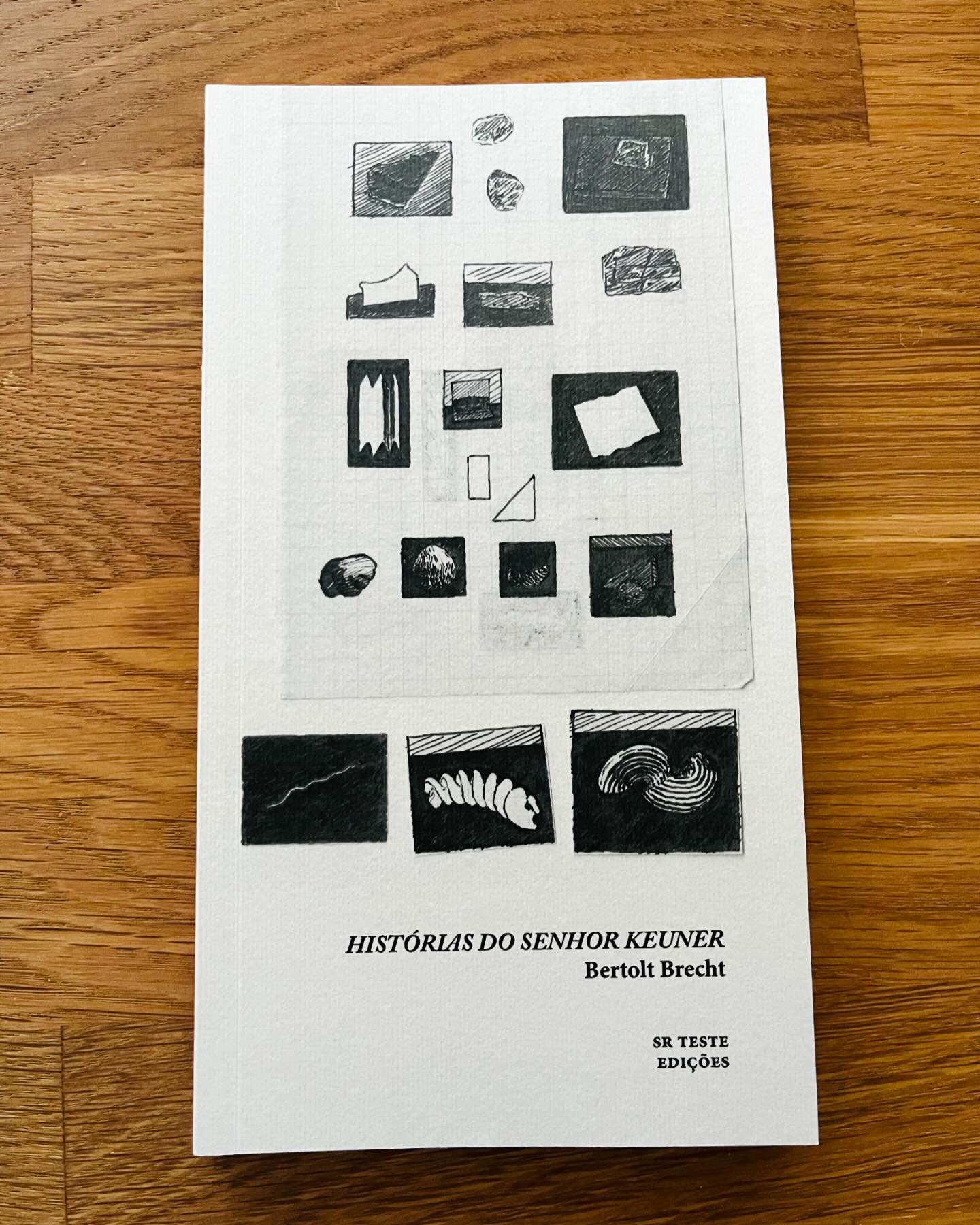 • Livro 'HISTÓRIAS DO SENHOR KEUNER' de Bertolt Brecht com capa branca e desenhos abstratos preto e branco