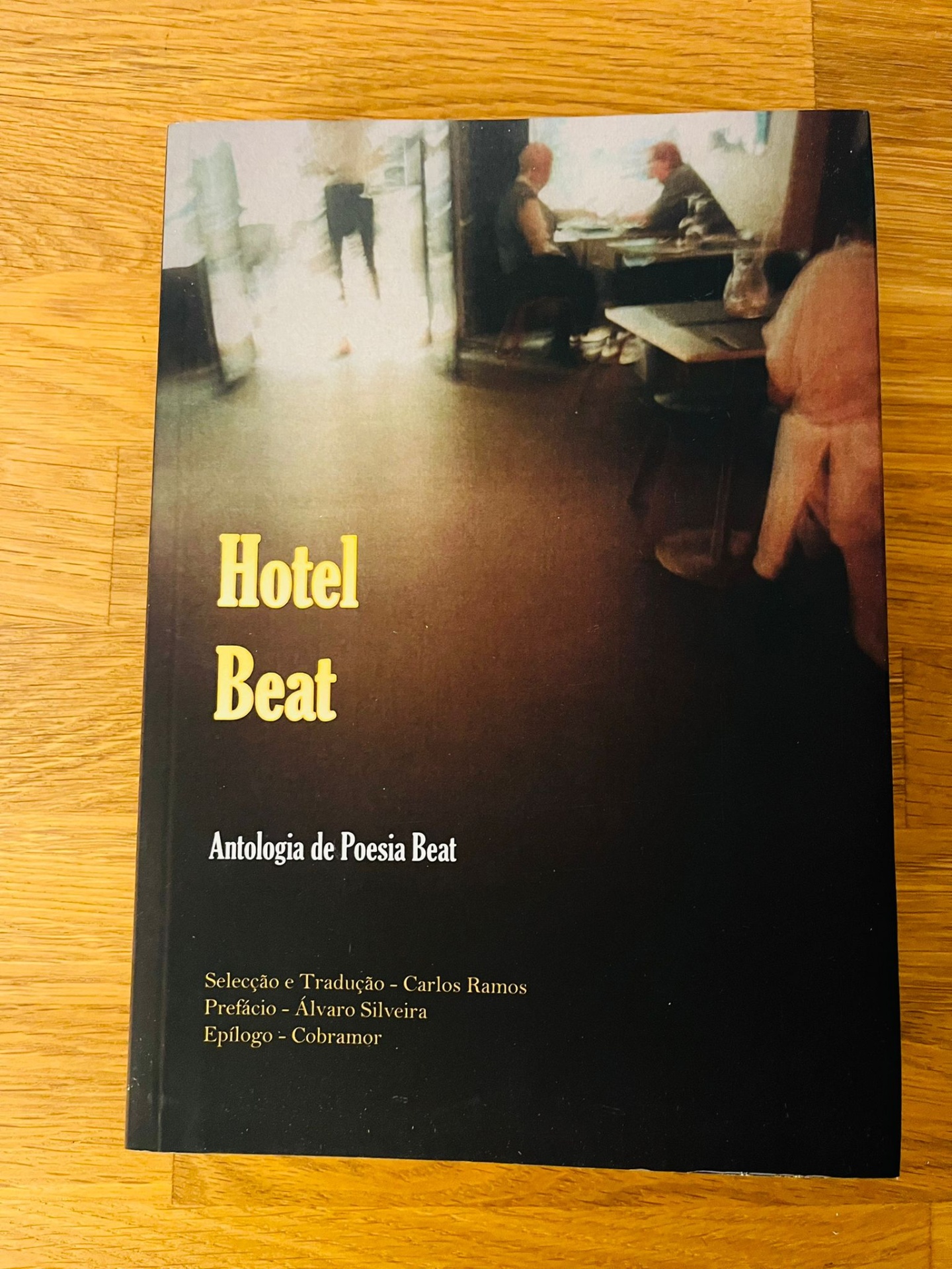 • Capa de livro 'Hotel Beat Antologia de Poesia Beat' com imagem desfocada de pessoas em mesas