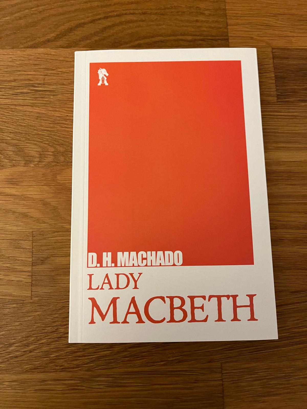 • Livro Lady Macbeth com capa branca e retângulo vermelho em cima de madeira