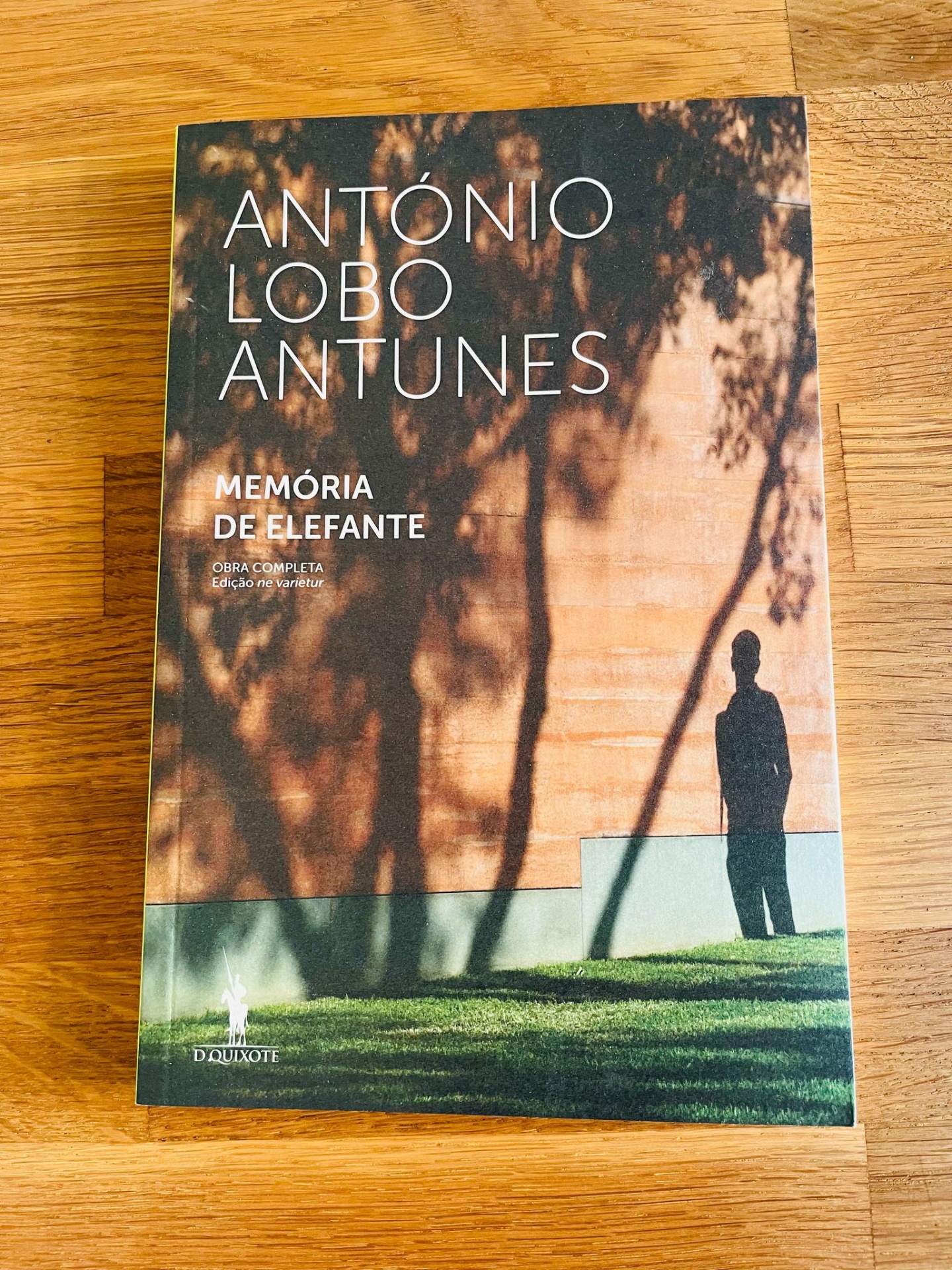 • Livro 'Memória de Elefante' de António Lobo Antunes com sombra de árvore e figura humana na capa