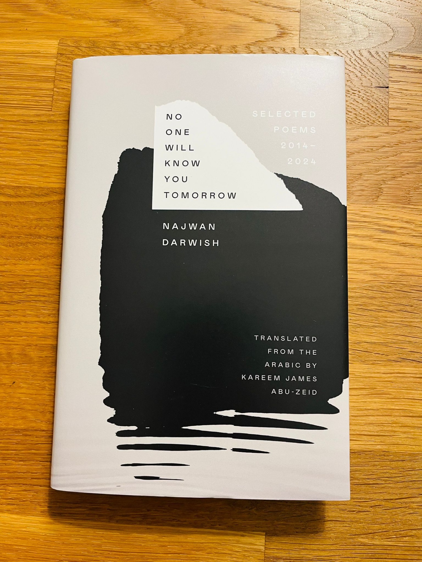 Livro No One Will Know You Tomorrow de Najwan Darwish com capa branca e preta sobre madeira.