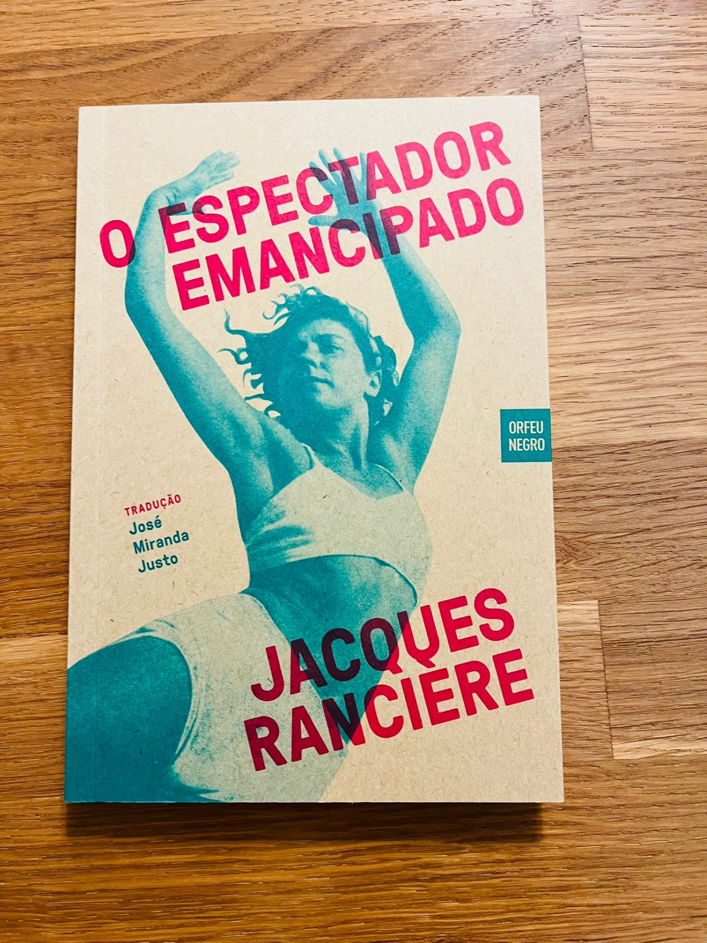 • Livro O Espectador Emancipado de Jacques Ranciere com capa bege e imagem azul de mulher