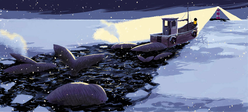 • Capa de livro infantil 'O REGRESSO da BALEIA' com baleia, barco, farol e neve