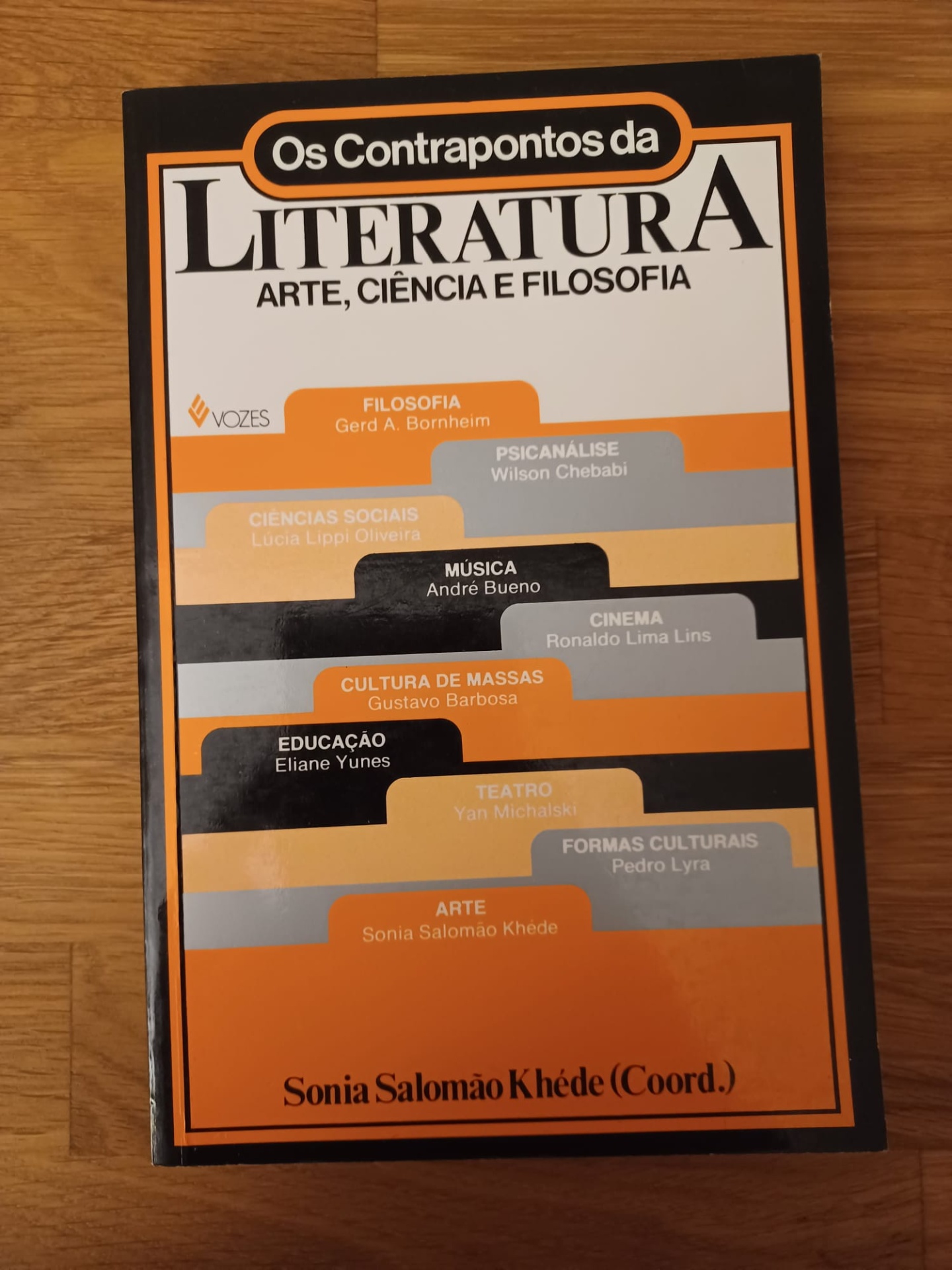 • Capa de livro com título sobre literatura, arte, ciência e filosofia em cores branco, preto e laranja