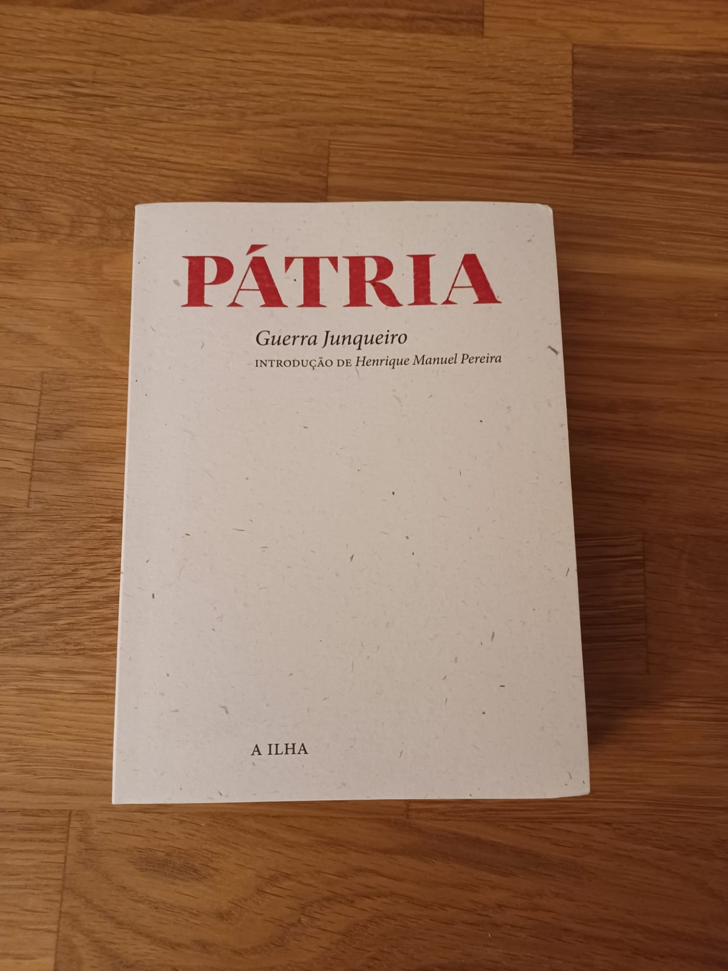 • Livro 'PÁTRIA' de Guerra Junqueiro com capa branca e texto vermelho e preto, sobre superfície de madeira.