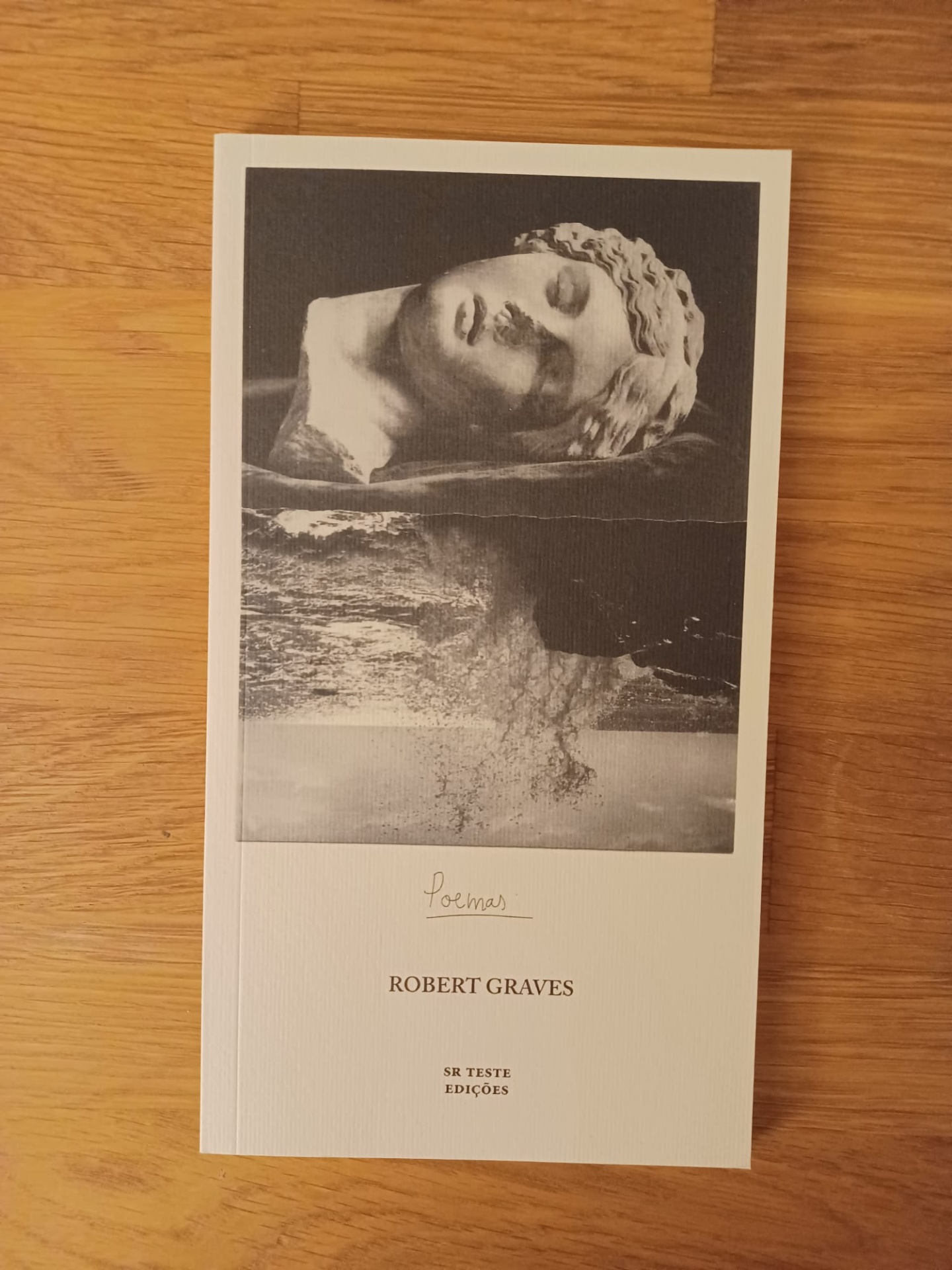 • Capa de livro Poemas de Robert Graves com imagem de estátua e paisagem em preto e branco