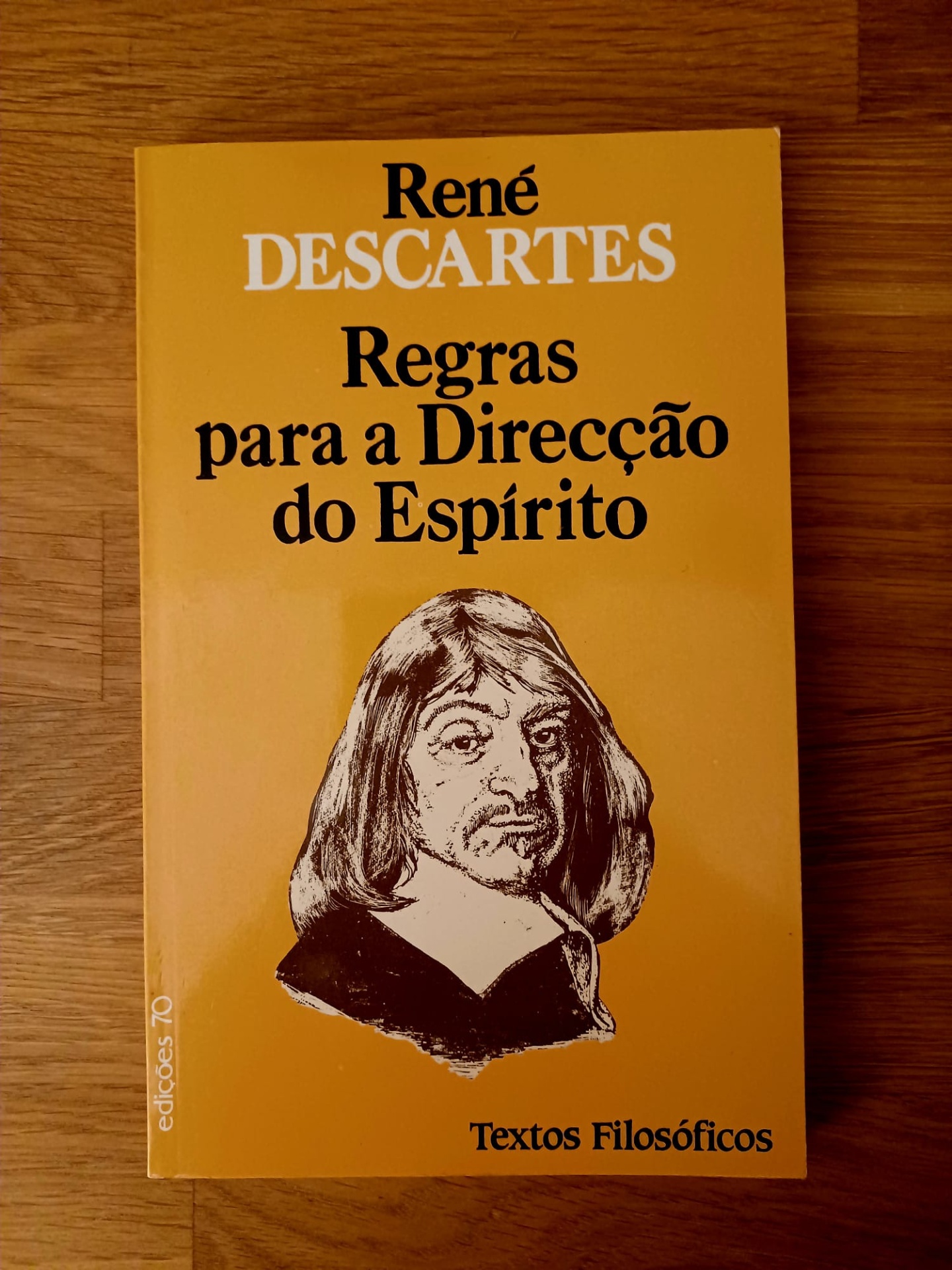 • Capa de livro amarelo com título e ilustração de René Descartes