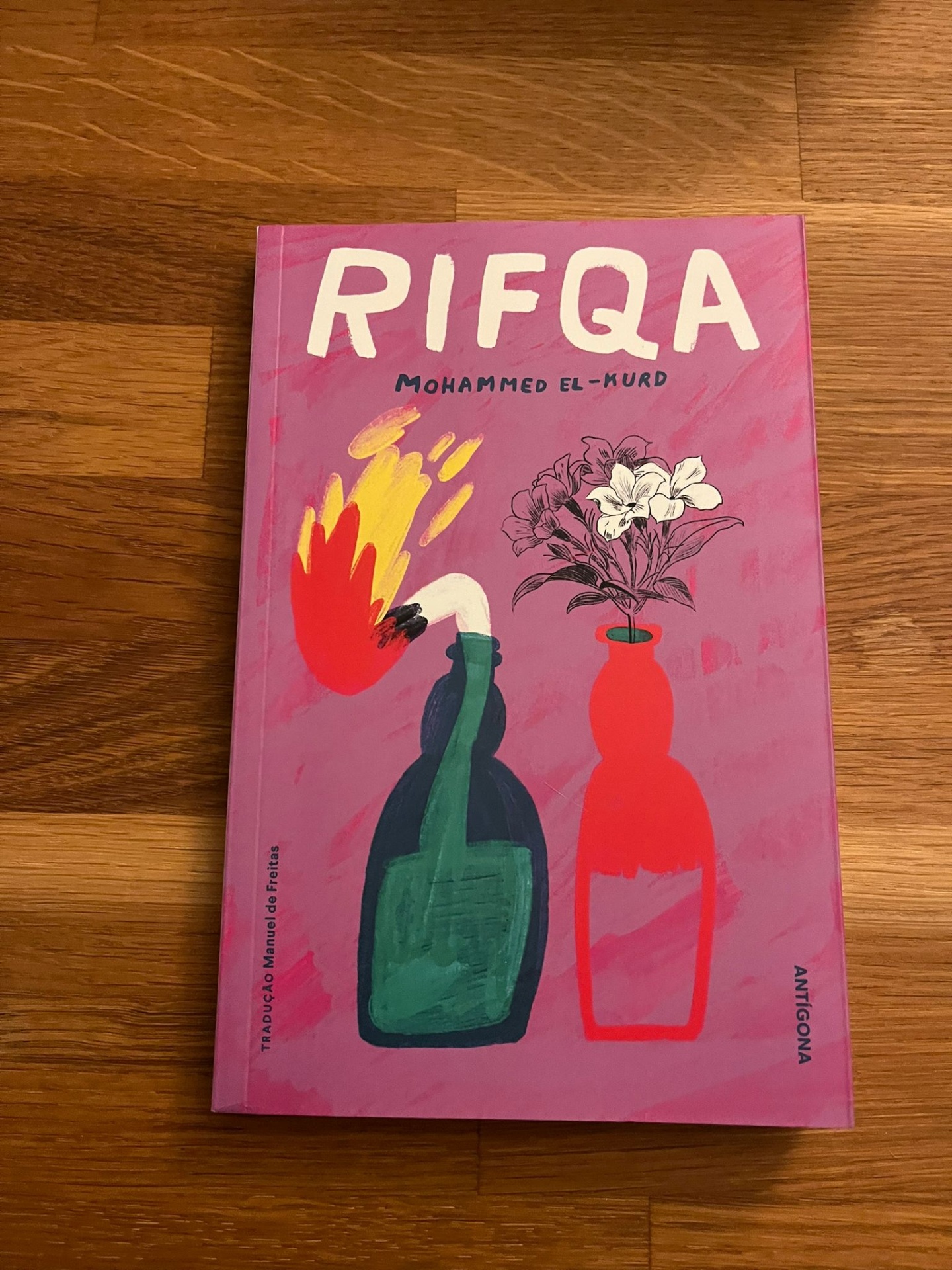 • Capa de livro rosa com ilustração de duas garrafas e texto 'RIFQA'