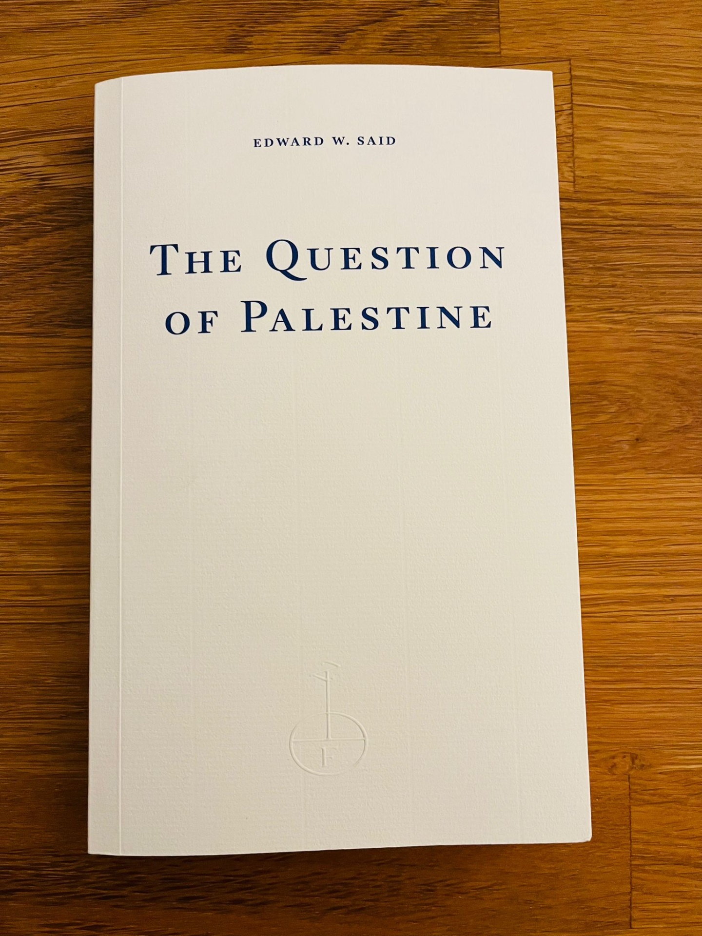 • Capa branca do livro THE QUESTION OF PALESTINE em fundo de madeira.