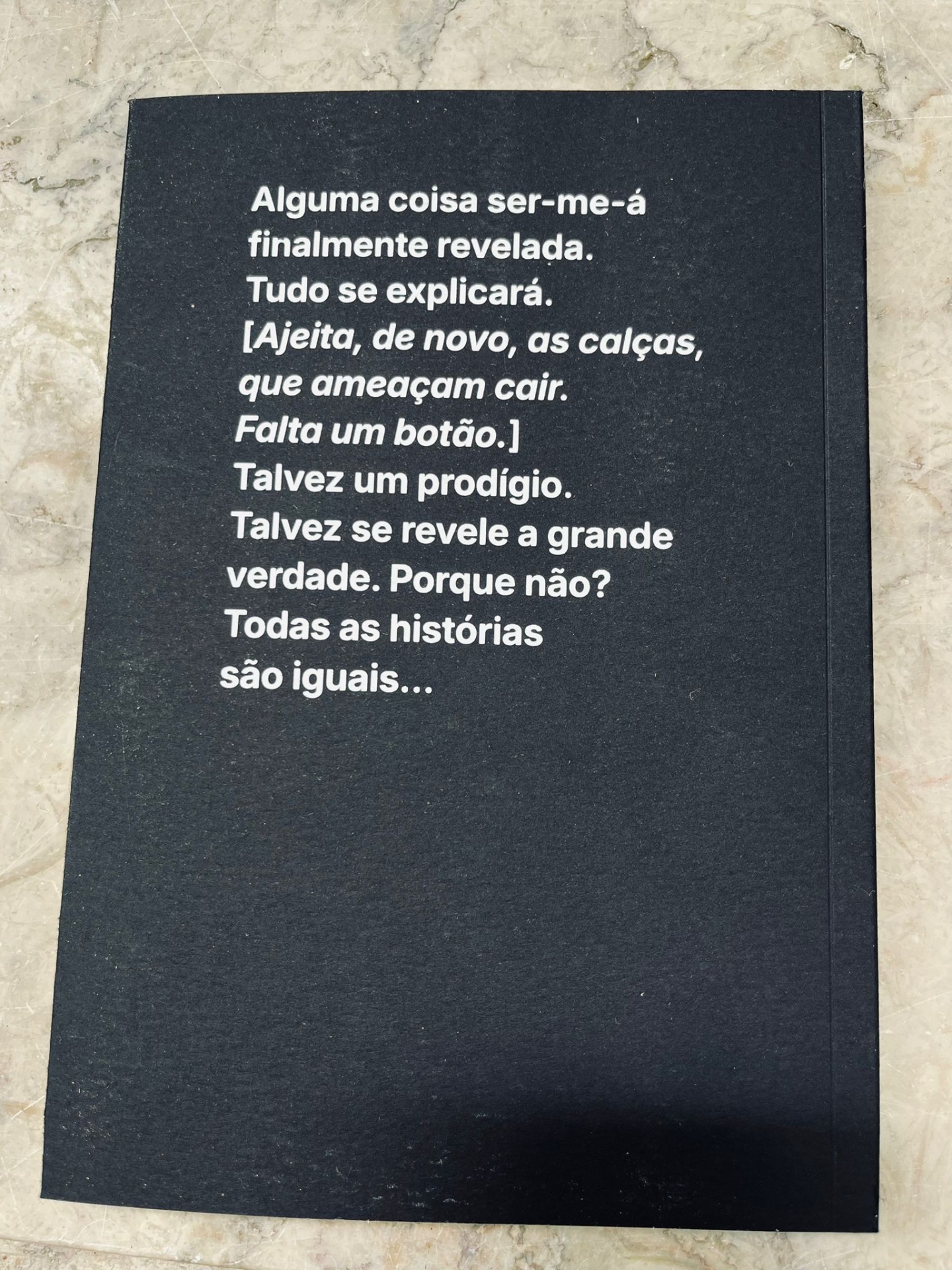 • Livro ou caderno preto com texto em português branco sobre uma superfície clara tipo mármore